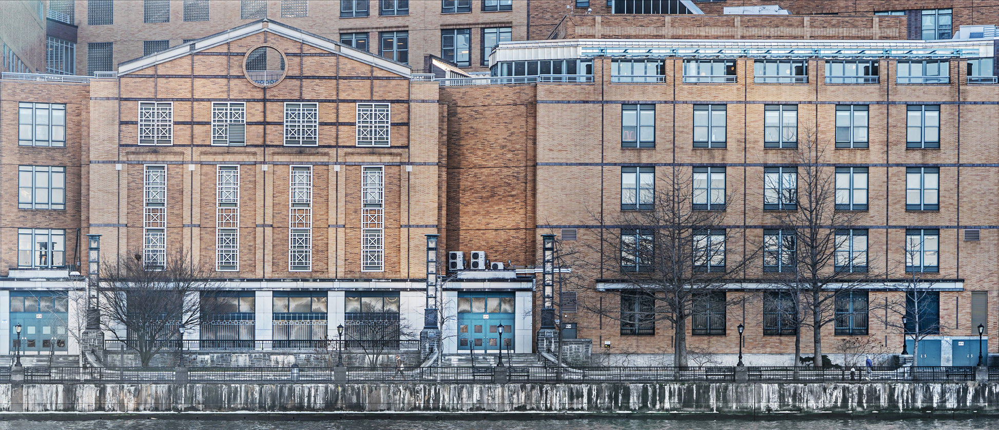 Step into the world of architectural splendour; a photographic artwork of a large brick building gracefully stretching along the banks of the Hudson River. Stark and captivating, it features clay-colored bricks juxtaposed against blue windows and leafless black trees, beautifully capturing the essence of winter. The contrast between the warmth of the clay bricks and the cool blue tones creates a visually striking composition, while the bare trees infuse a sense of resilience.