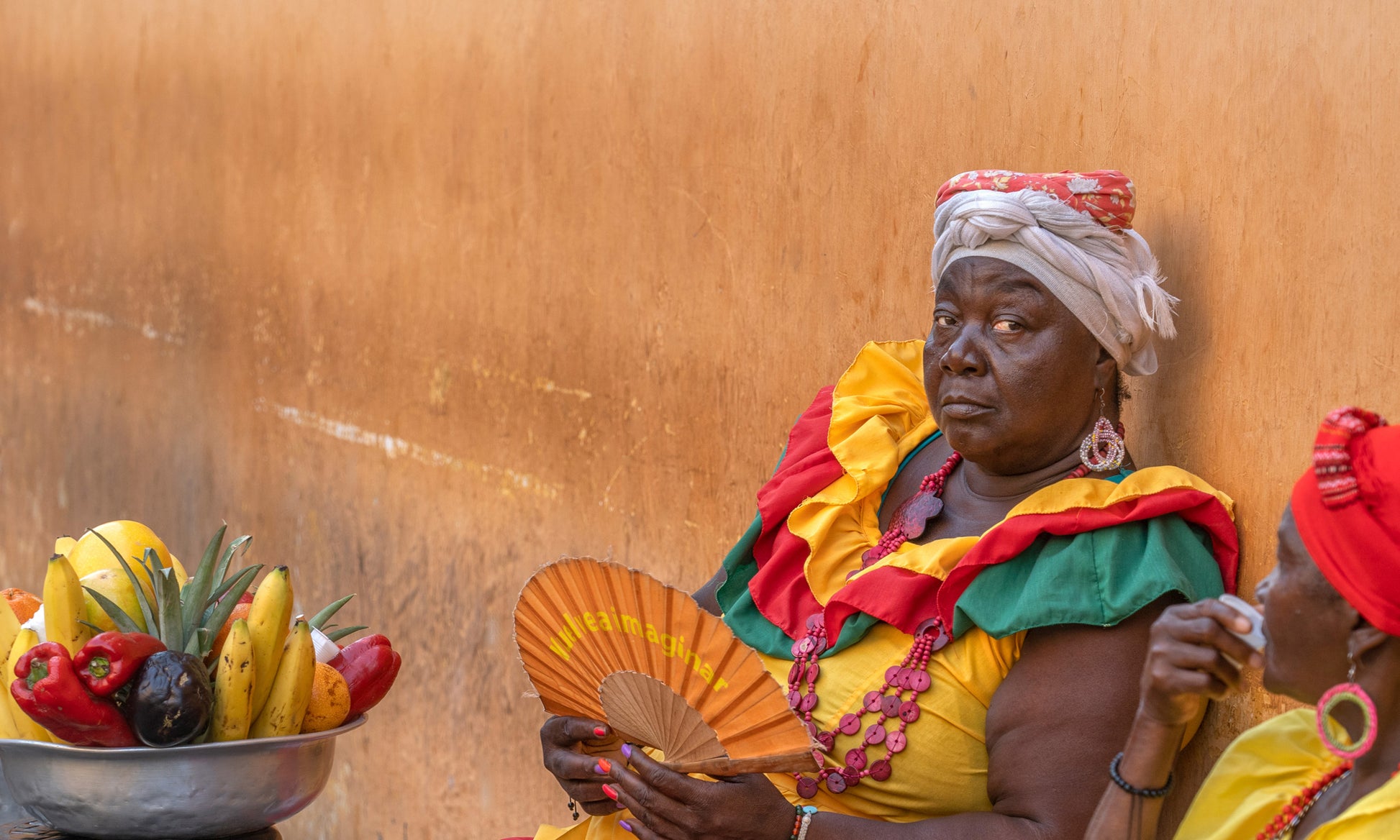 Immerse yourself in the vibrant streets of Cartagena with our captivating photograph, 'Palenquera'. This powerful image features a Palenquera adorned in the typical red, yellow, and green hues, representing the essence of her cultural heritage. She holds a fan to cool herself during her work as a street vendor and an iconic photographic subject for tourists. A bowl of tropical fruits, usually carried on her head, rests nearby as she leans against an ochre wall. Her gaze conveys suspicion or perhaps a hint of indignation at the photographer capturing this candid moment. The image celebrates the resilience and pride of the Palenquera, a symbol of Colombia’s rich traditions and cultural identity.