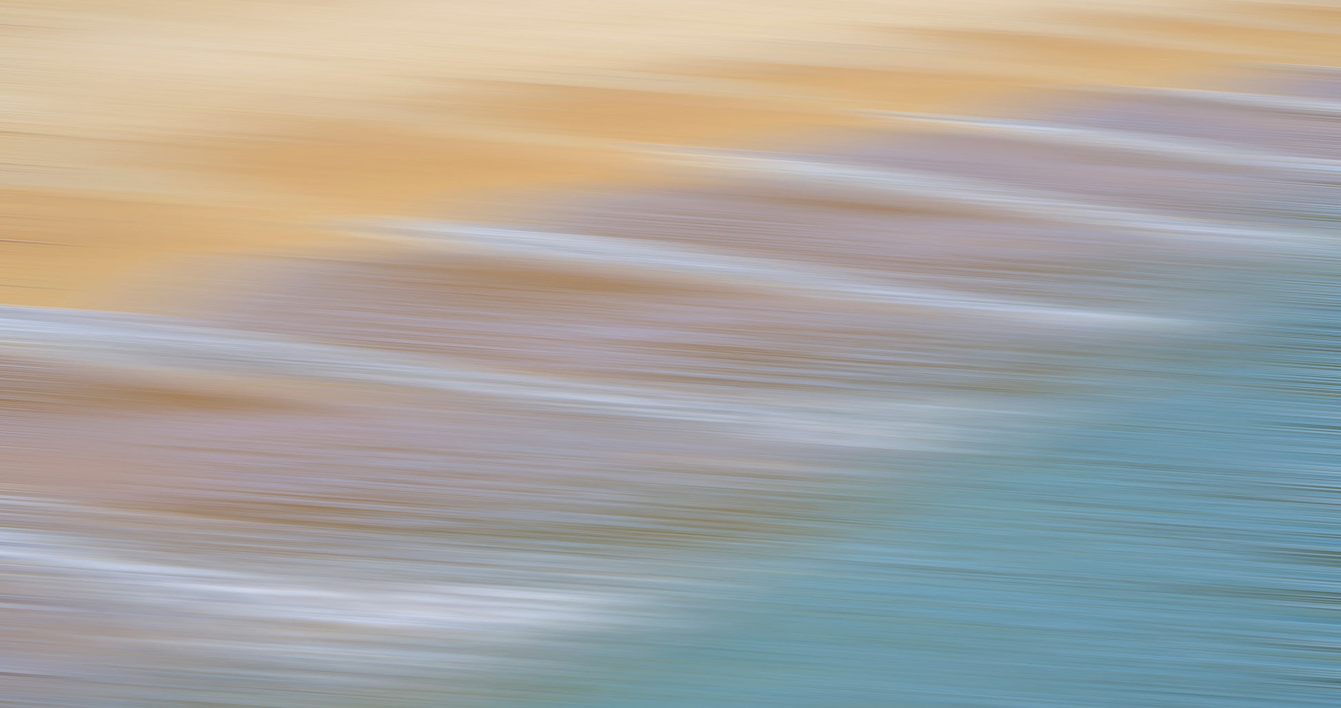 A photographic artwork that encapsulates the rhythmic choreography between nature's elements. The aqua blue of the ocean converges harmoniously with the sun-kissed golden sands, an ethereal boundary where liquid and solid coalesce. The deliberate use of camera movement paints a poetic portrait of the tide's graceful advance, as if the very essence of water and shore were engaged in a serene waltz. Glistening streaks of white foam, akin to delicate brushstrokes, accentuate the ebb and flow of this timeless dance, evoking a sense of perpetual motion and fleeting beauty within the tranquil coastal expanse.